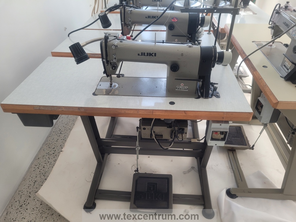 Juki DDL-555-4 1-jehlový šicí stroj se spodním ponorným podáváním a odstřihem nitě, centrální mazání, automatický odstřih, automatické zapošívání, magnetický zdvih patky, nastavitelná délka stehu 0-5mm, lampička - osvětlení šicího stroje, komplet šicí stroje s výškově stavitelným stavcem a deskou o rozměru 105x55cm, pohon motorem EFKA s napájením 3x380V, použitý šicí stroj za velmi dobrou cenu